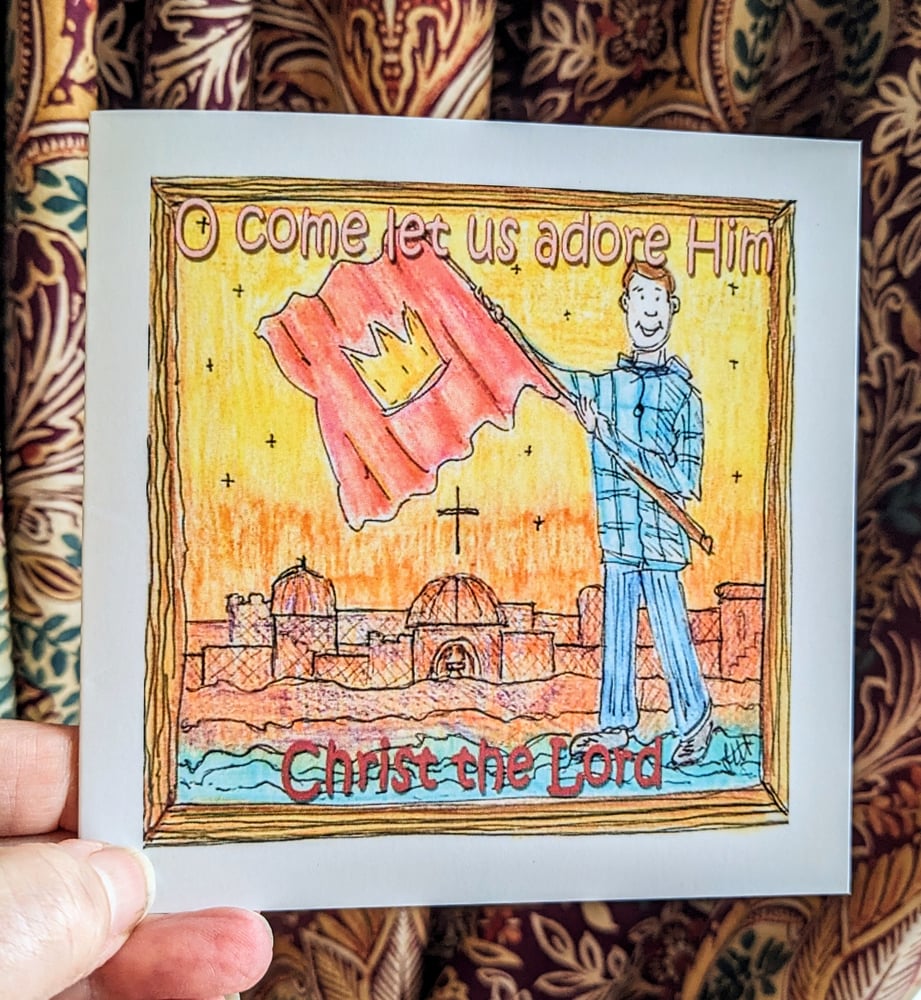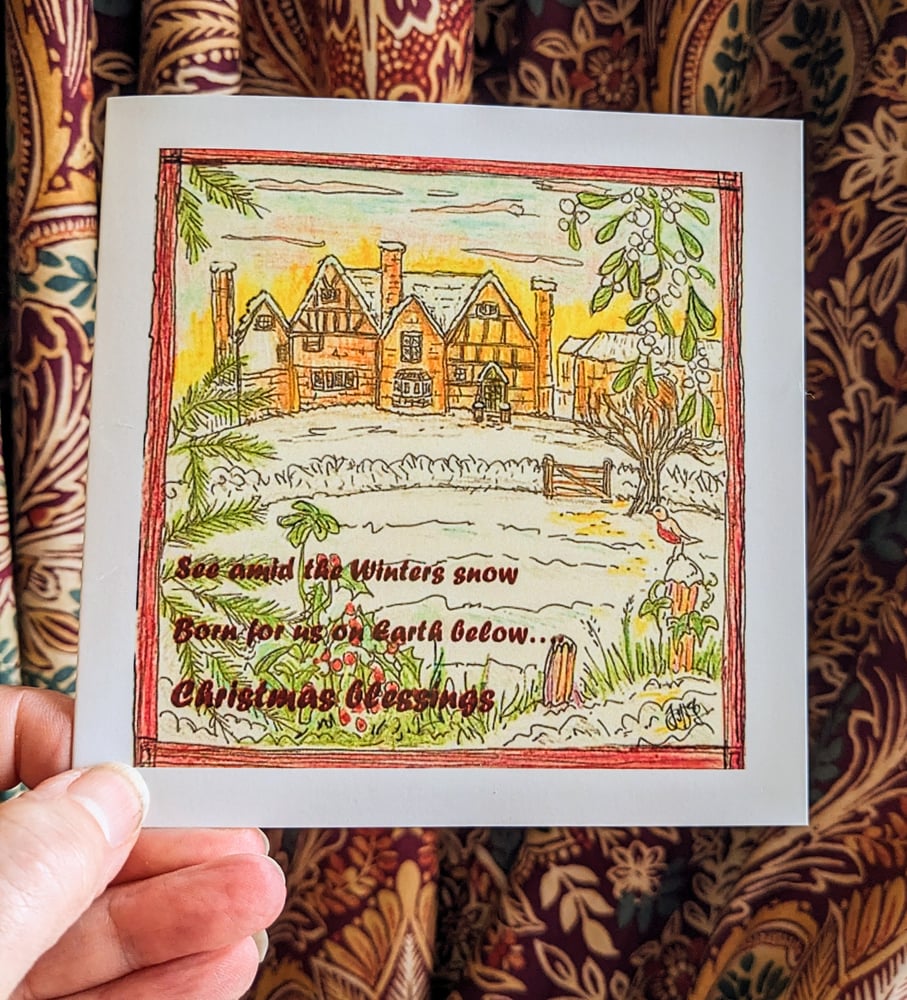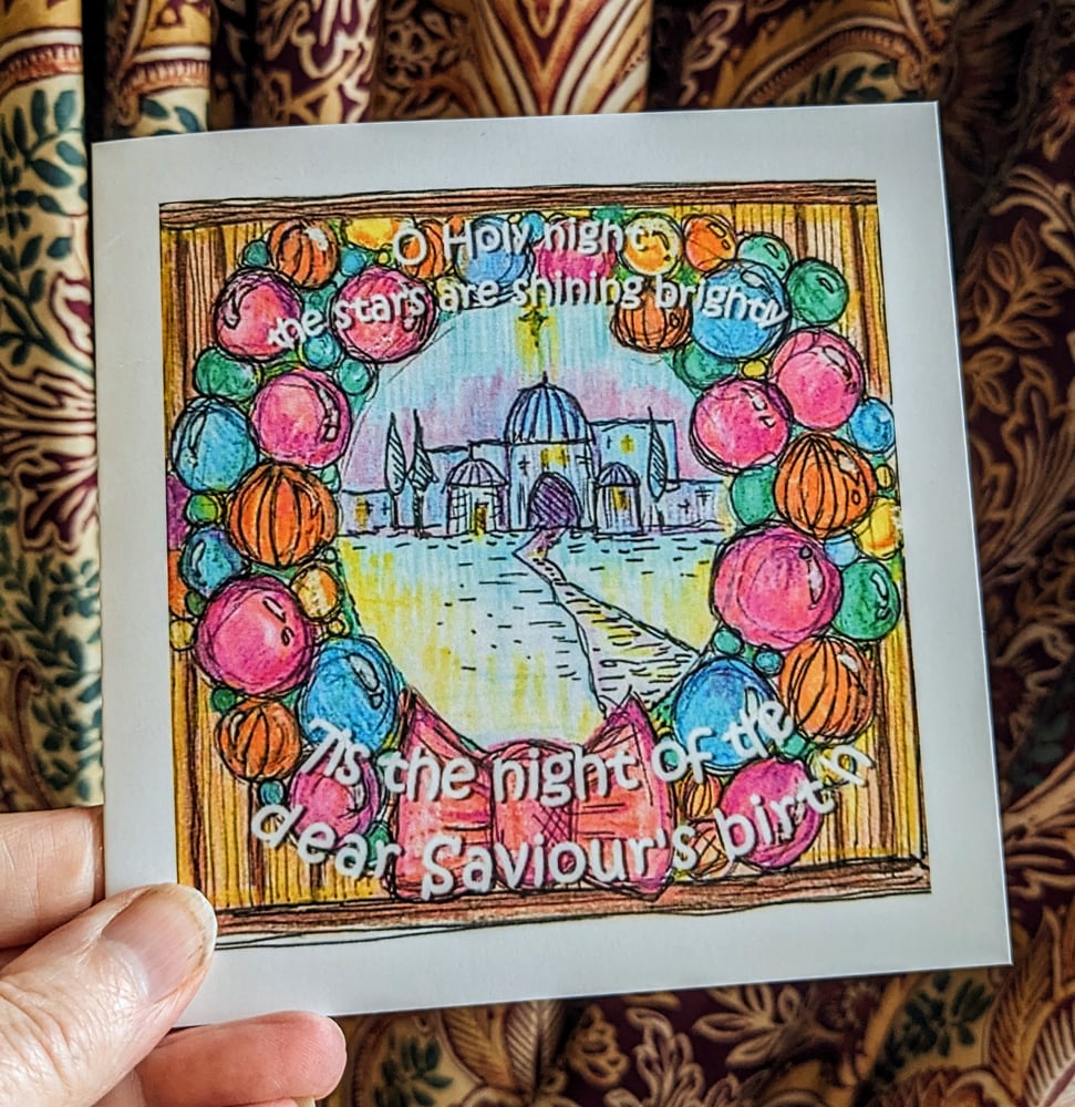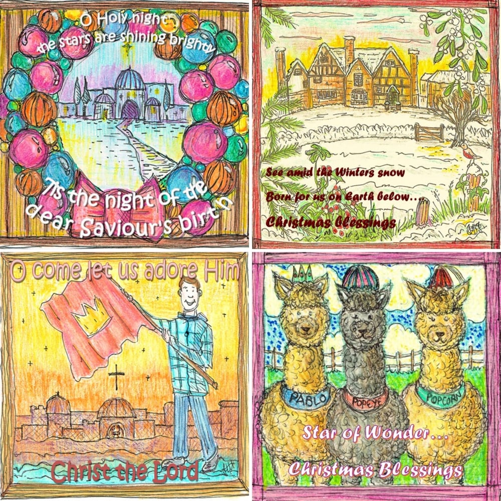 A set of four Christmas designs 5x5 with different carol words on them 2 of each design in pack printed on 300gsm silk sustainable card plus envelope